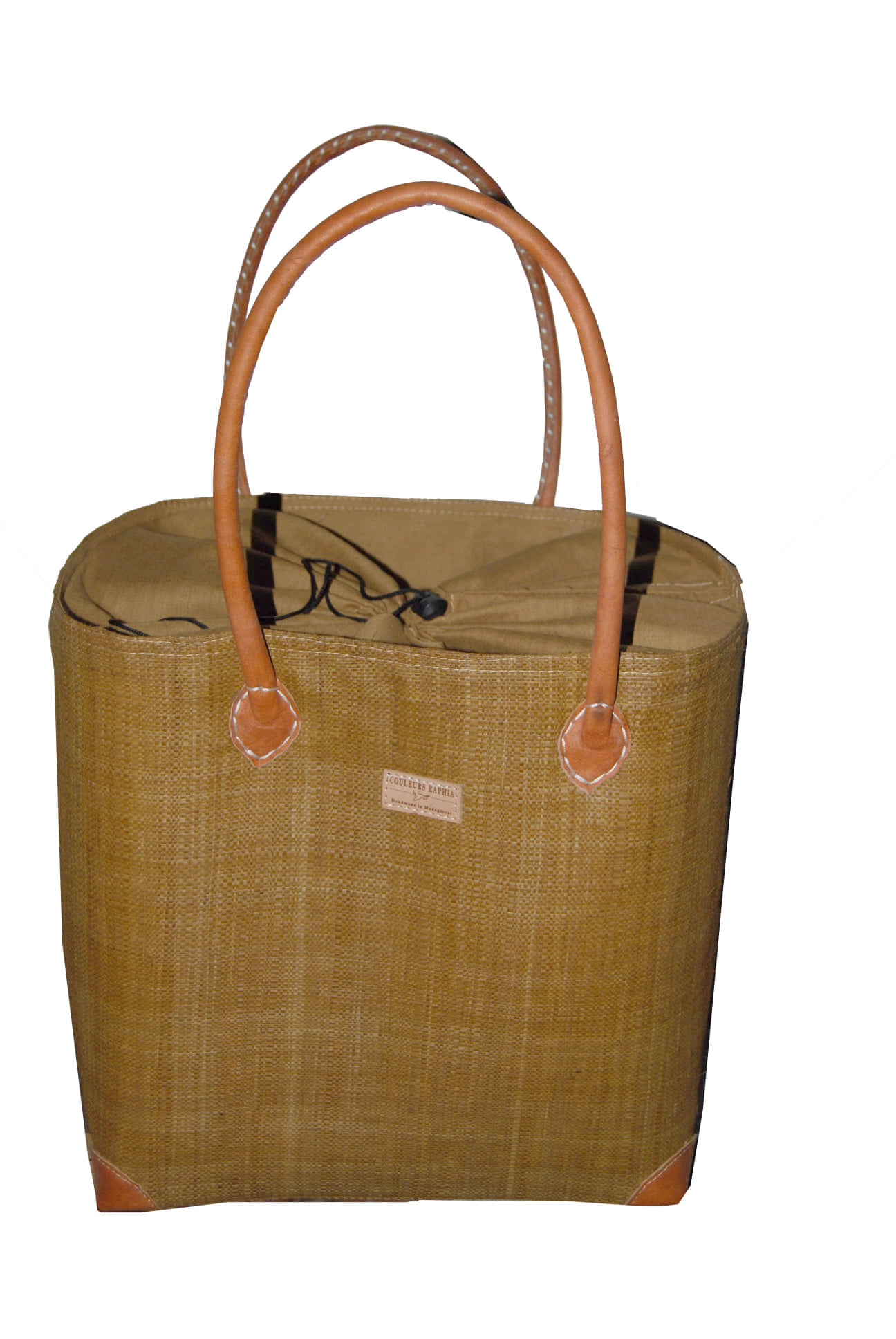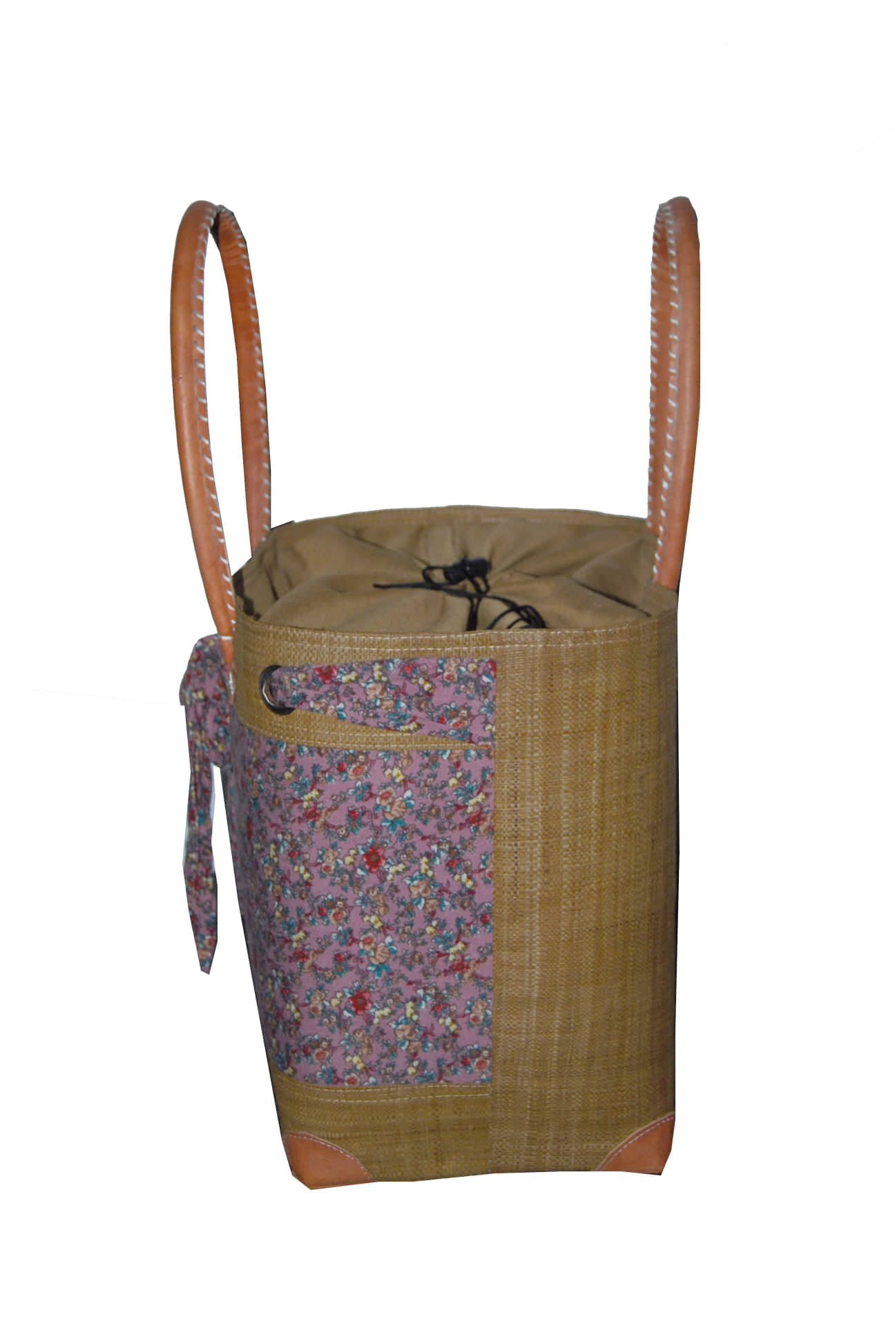 Cabas habillé en raphia et en tissu imprimé, les anses et les 4 coins sont en cuir . Elle se ferme avec un tissu et cordellet comme un système pochon , muni d’ une poche à l’intérieur.