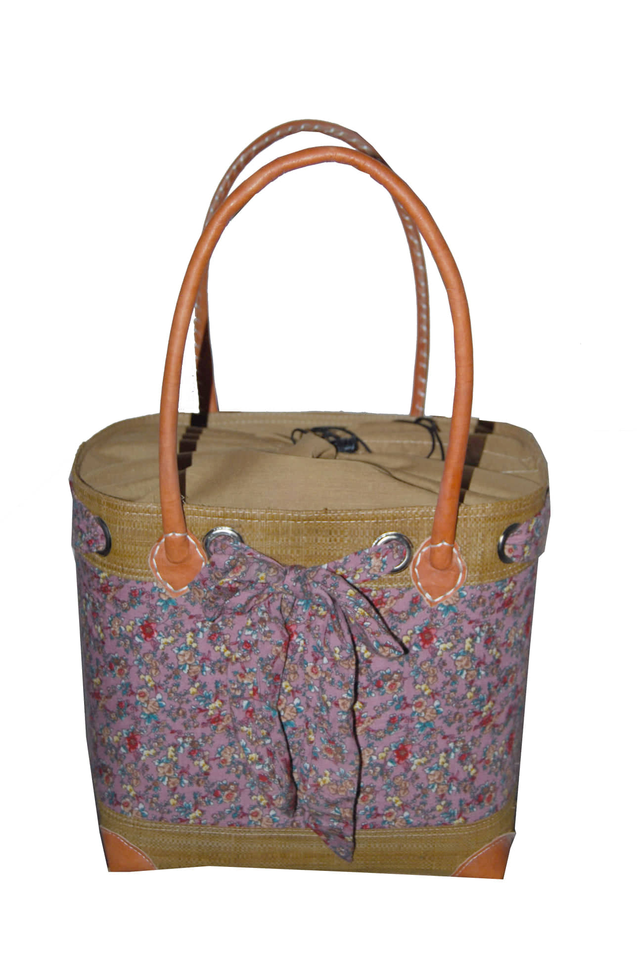 Ce beau cabas à moitié raphia et moitié tissus avec les anneaux au tours et la petite foulard pour former un nœud est juste chic et féminine .