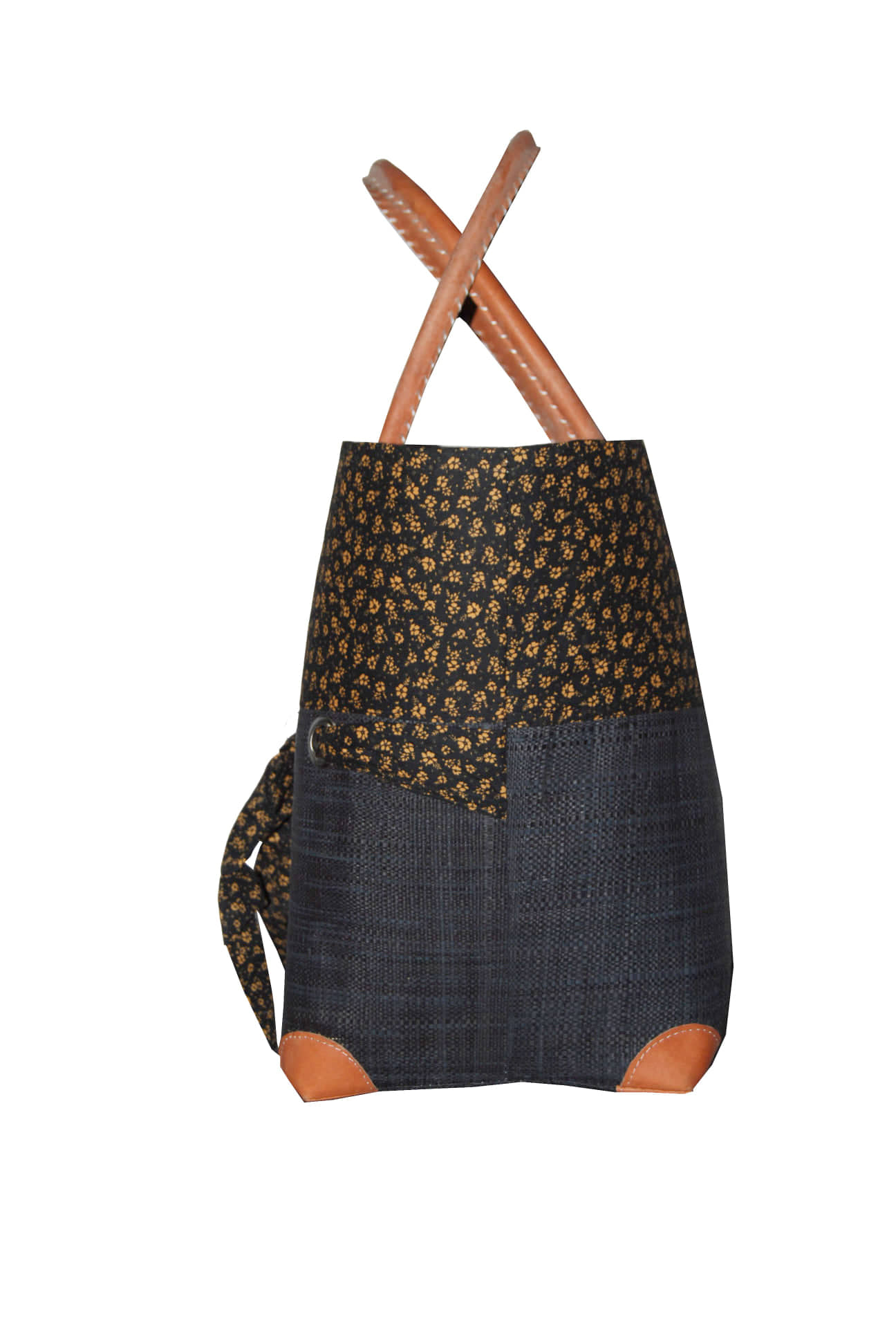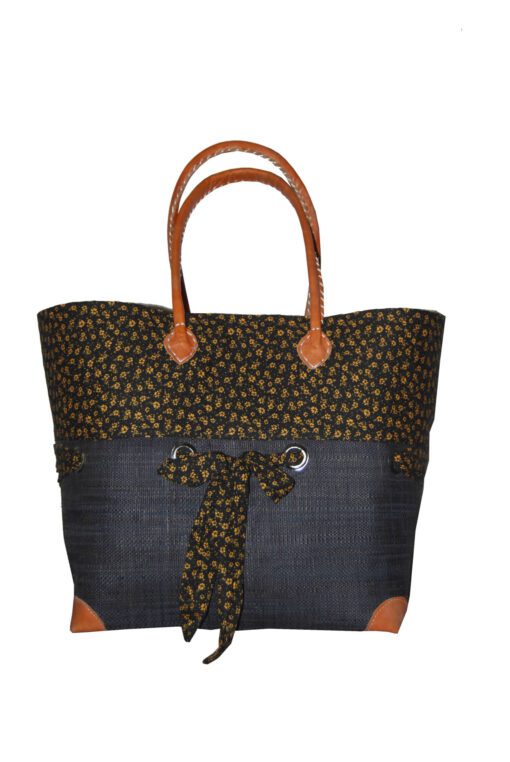 Cabas habillé en raphia et en tissu imprimé, les anses et les 4 coins sont en cuir . Elle se ferme avec un tissu et cordellet comme un système pochon , muni d’ une poche à l’intérieur.