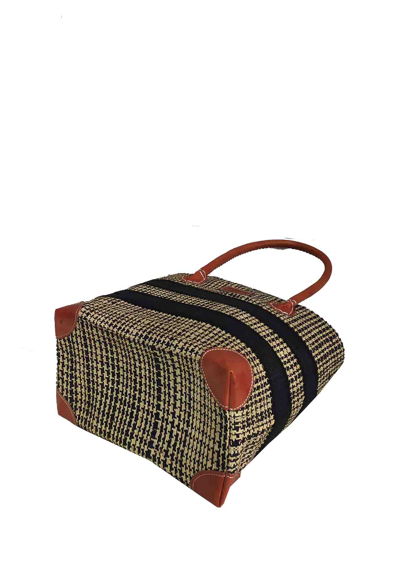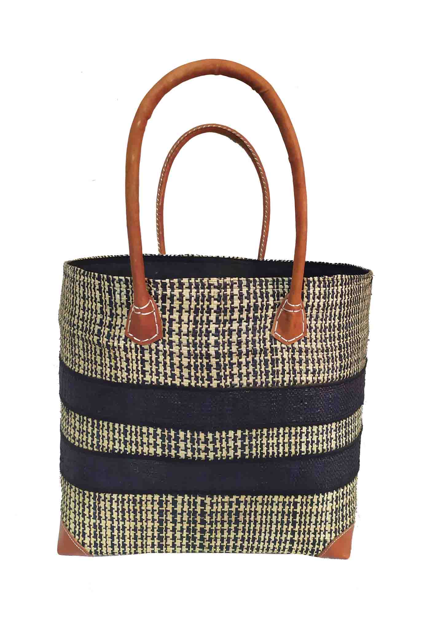 Grand cabas raphia avec des motifs en bandes noir, ce cabas en paille à l’ intérieur et habillé en Rabane à l’ extérieur est idéal pour vos courses, pour le sac de plage, sac pic nic, .., munis d’une poche à l’intérieur, peut se fermer avec un pochon, les anses et les 4 coins sont en cuir .