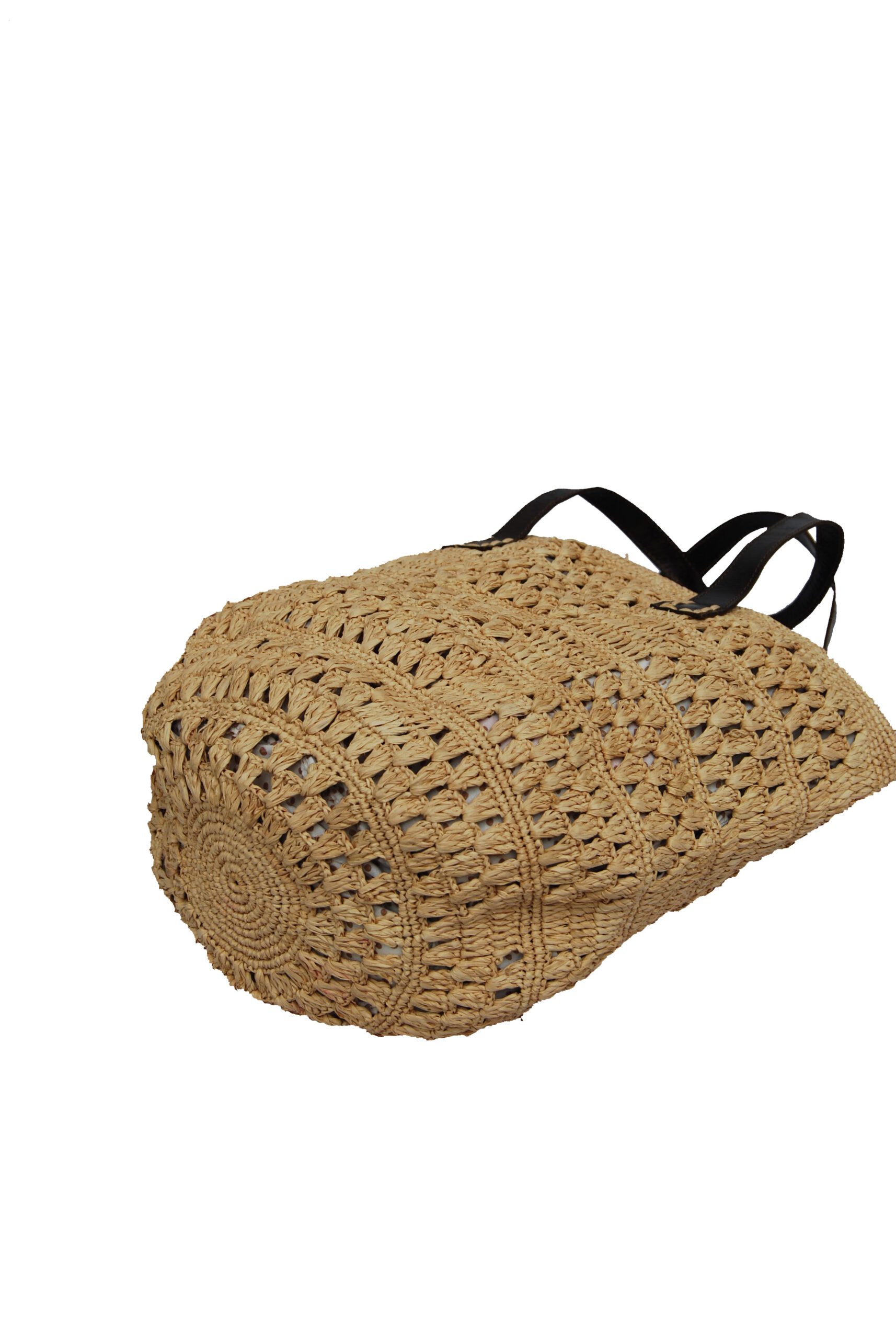 Sac raphia crocheté en raphia Naturel, Doublée par un tissu et se ferme à l’aide d’une fermeture. C’est un sac qui se porte à l’épaule grâce à ses longues anses en cuir.