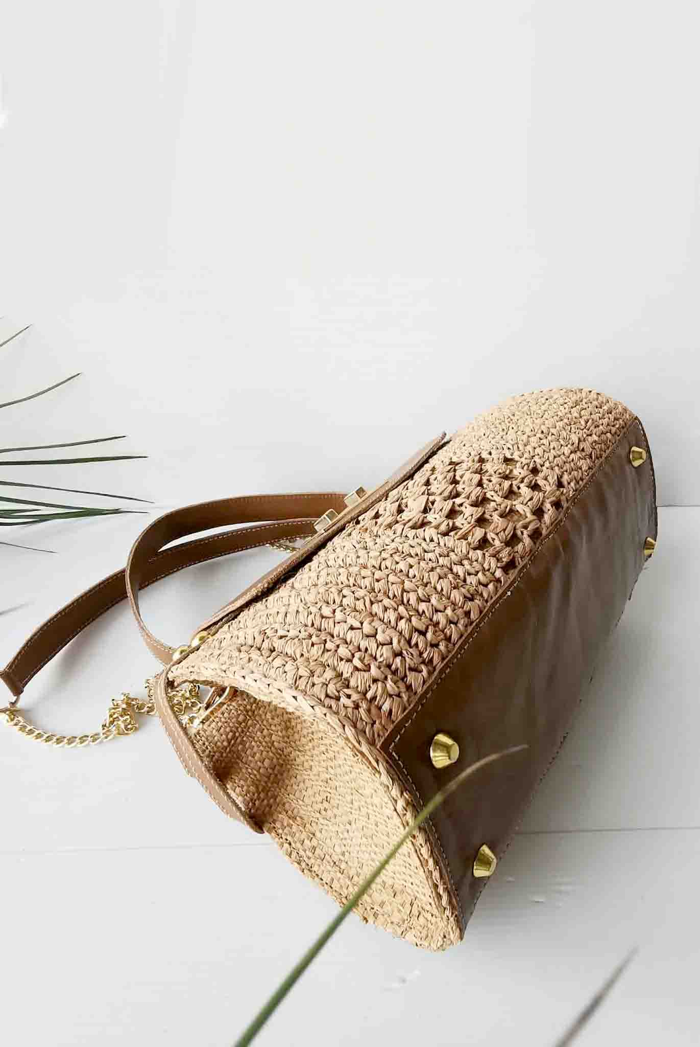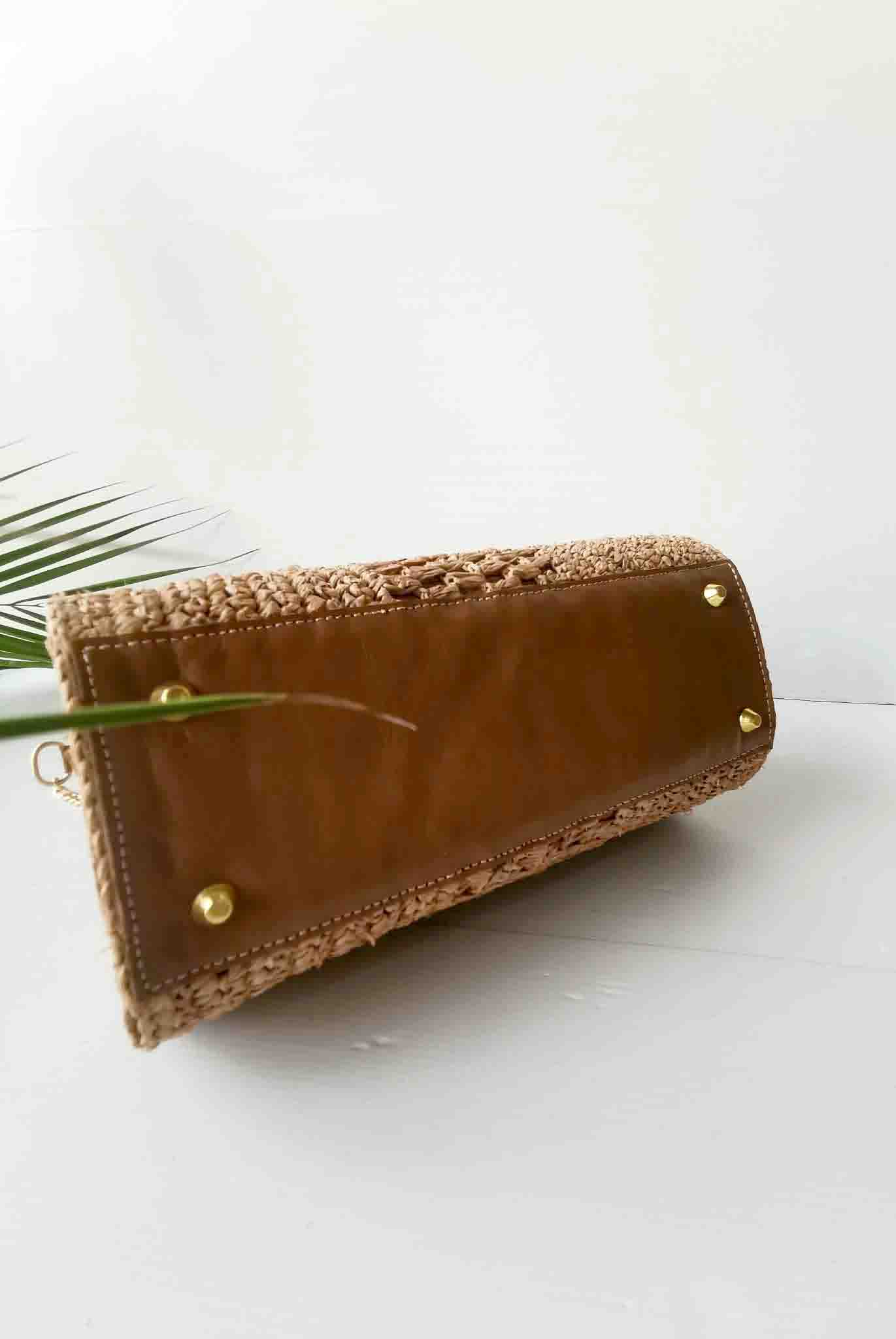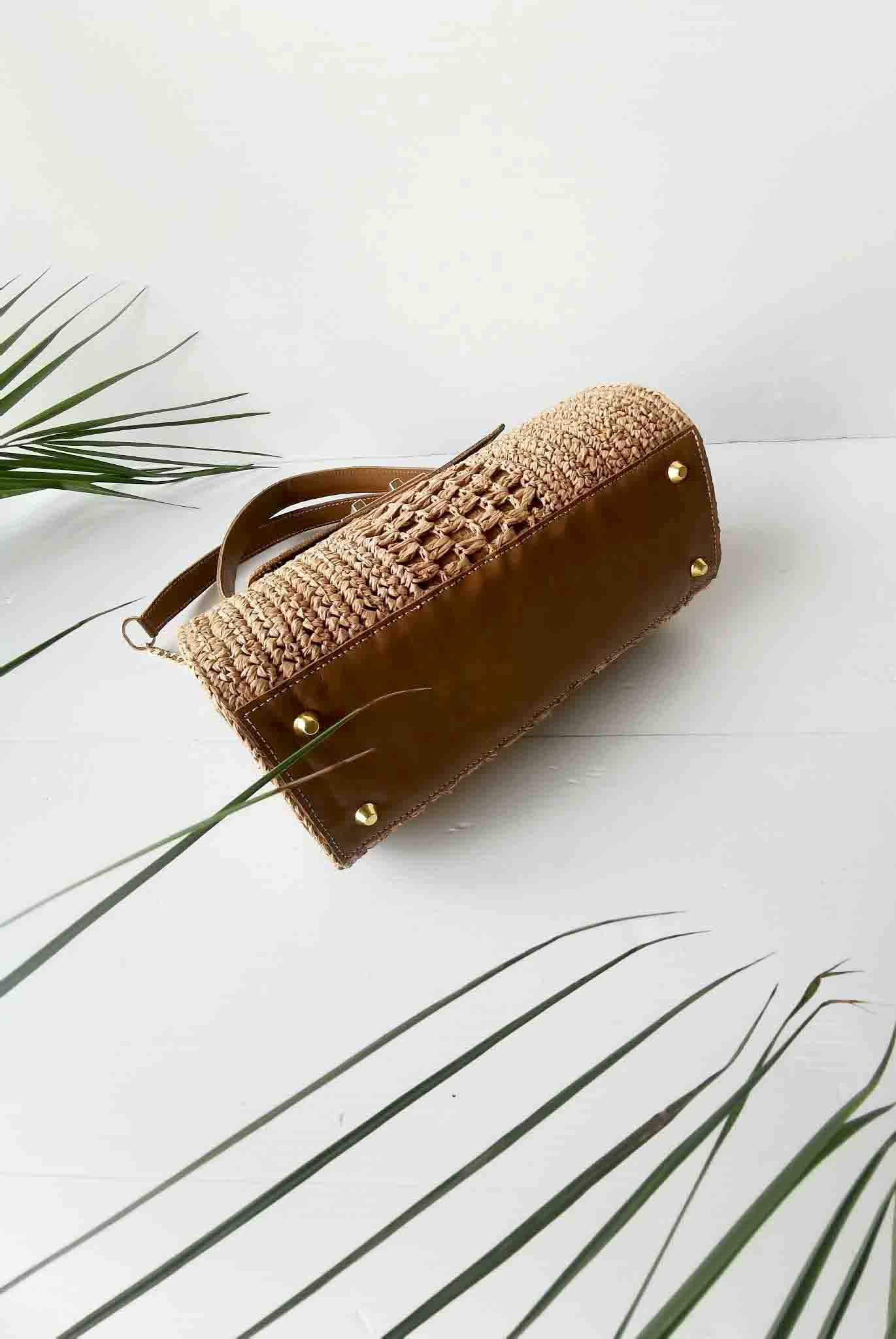 Le sac Promesse Thé, un sac artisanal confectionné à la main en raphia crocheté avec des finitions en cuir de zébu véritable. Ce sac en raphia pour femme allie élégance, authenticité et savoir-faire artisanal malgache.