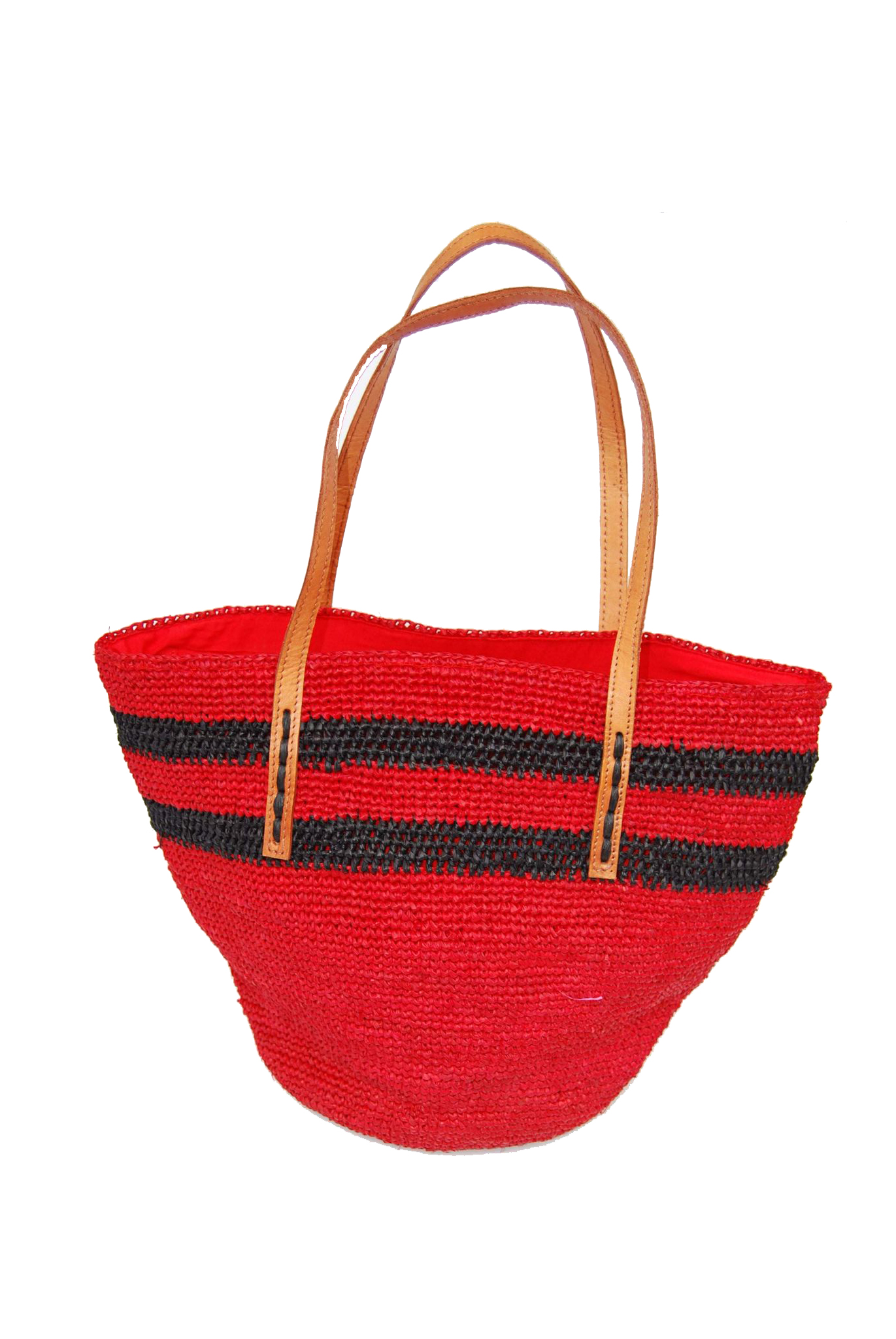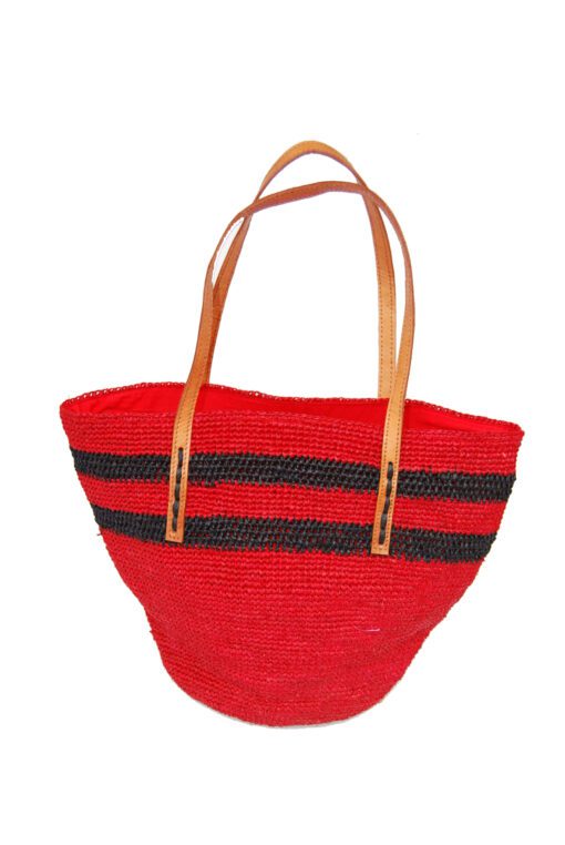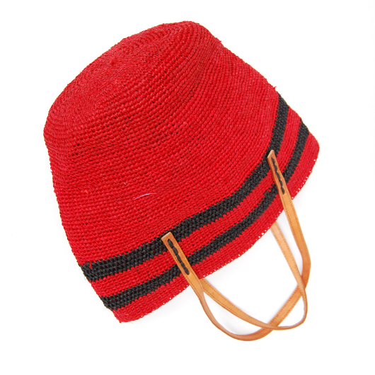 Sac raphia crocheté en raphia rouge, avec une petite touche de de raphia noir en guise de motif.