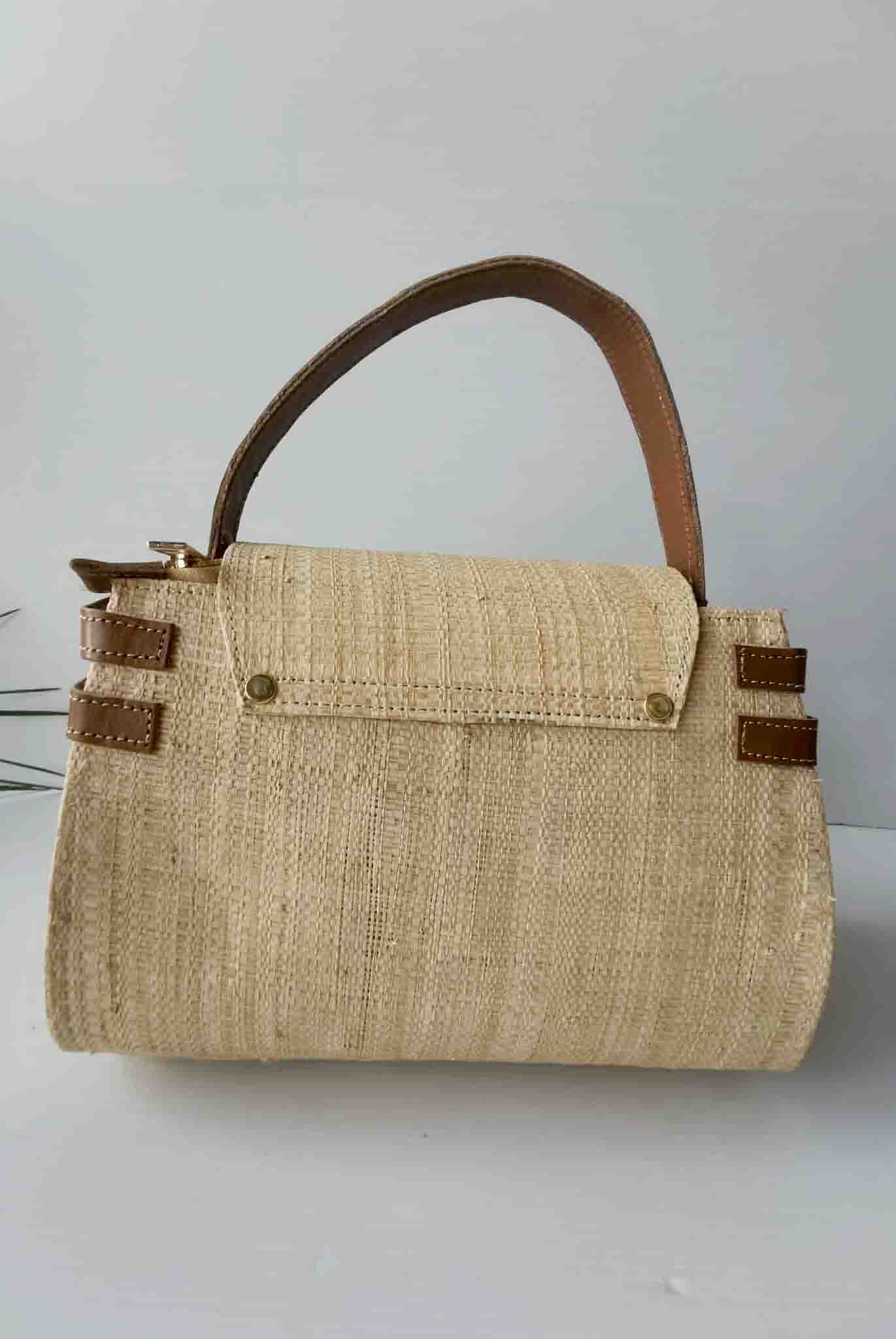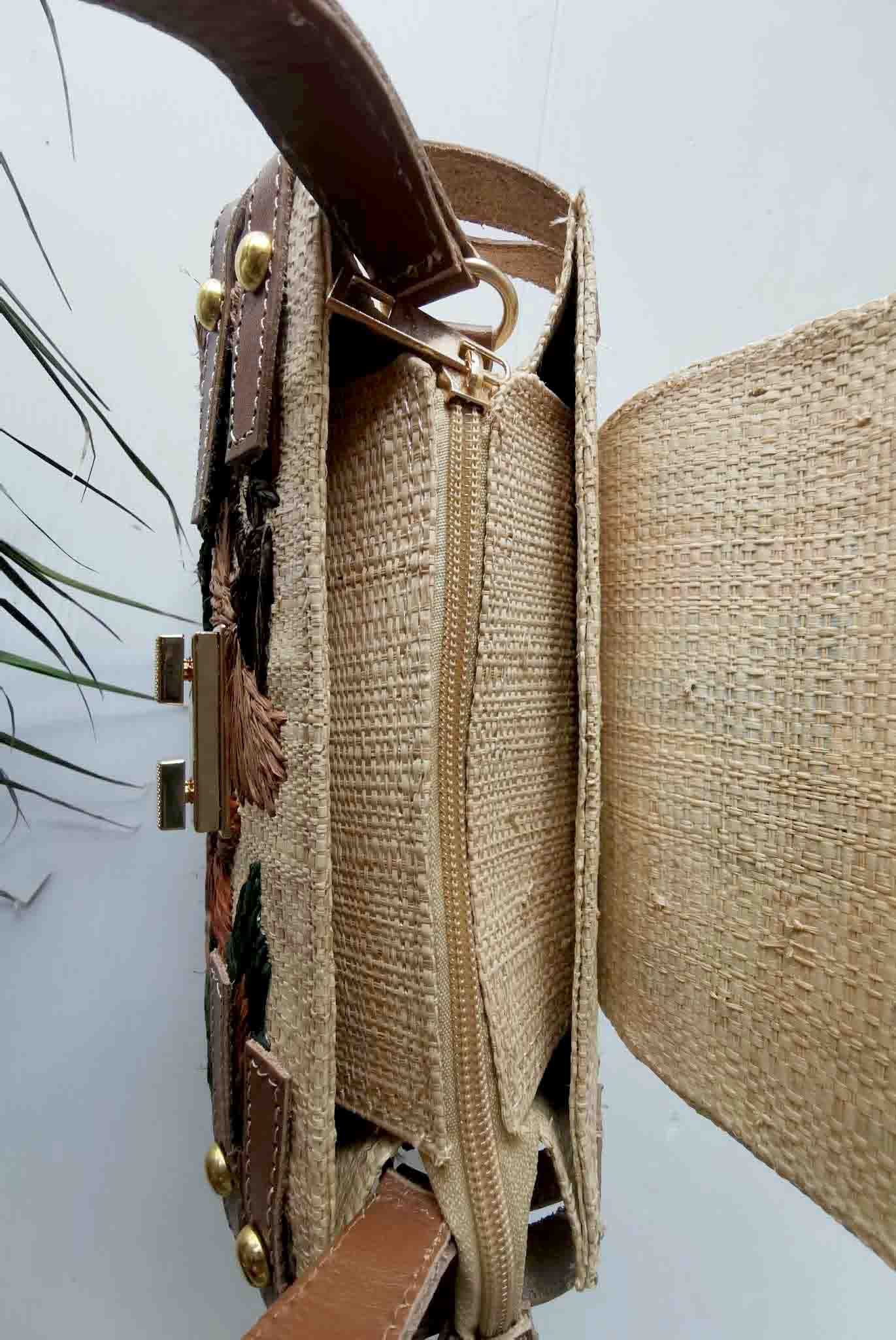 Son rabat structuré et sa poignée en cuir de zébu offrent à la fois solidité et raffinement. Les détails métalliques ajoutent une finition moderne, tandis que la texture naturelle du raphia souligne son authenticité.